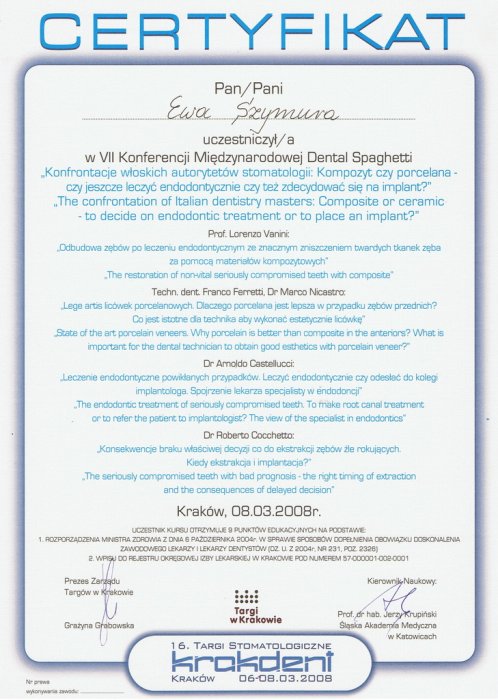 Kwalifikacje zawodowe podnosi regularnie uczestnicząc w praktycznych i teoretycznych kursach, szkoleniach i sympozjach stomatologicznych prowadzonych przez wykładowców krajowych i zagranicznych.